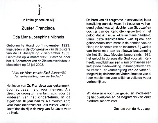 | Aantekening | Zuster Francisca |