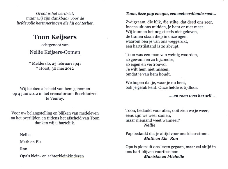 | Aantekening | Toon is gecremeerd (Crematorium Venray-Boschhuizen) |
