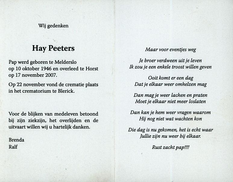 | Aantekening | Hay is gecremeerd (Crematorium Venlo-Blerick) |