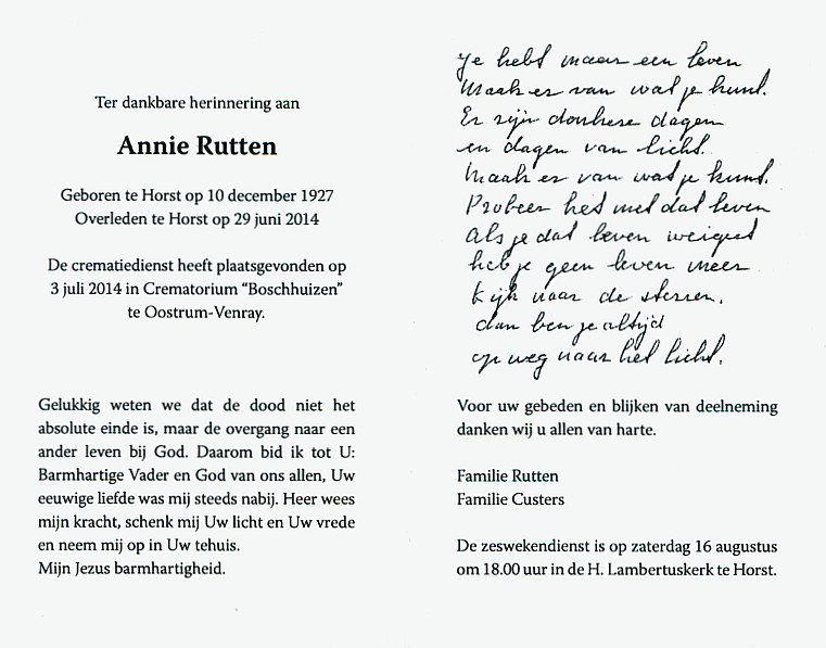 | Aantekening | Annie is gecremeerd (Crematorium Venray-Boschhuizen) |