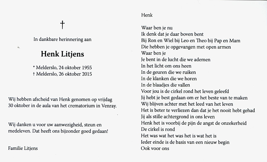 | Aantekening | Henk is gecremeerd (Crematorium Venray-Boschhuizen) |