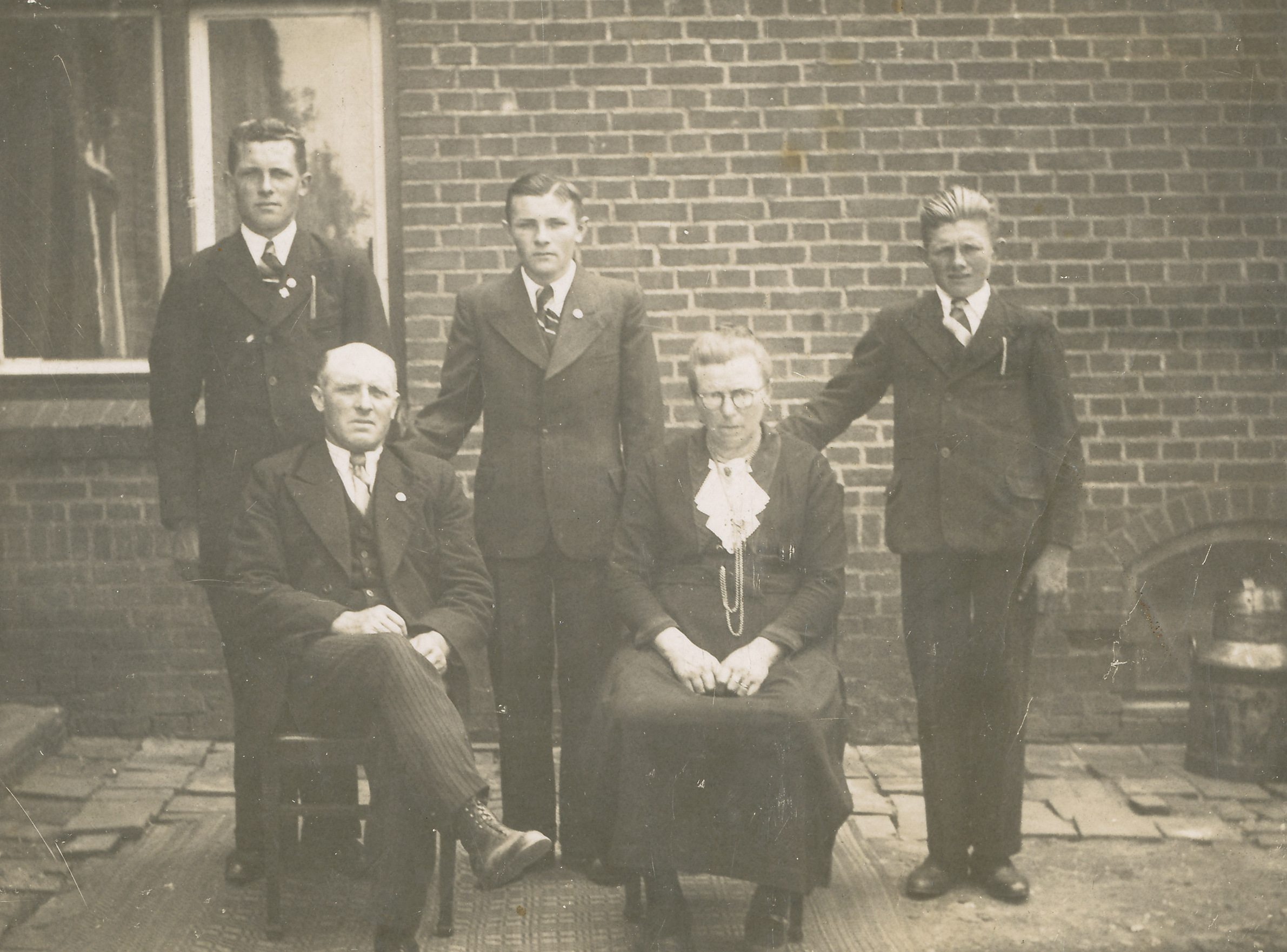 Foto 8. De familie Claassens in 1936. Zittend: Mathijs Claassens en zijn tweede echtgenote Hermina (Dien) Clabbers. Staand v.l.n.r.: Herman, Chris en Hay Claassens. De foto is genomen achter het huis bij de spoorwegovergang op de Broekhuizerdijk. Het raam gaf uitzicht op de boerderij van Lei van Rens.